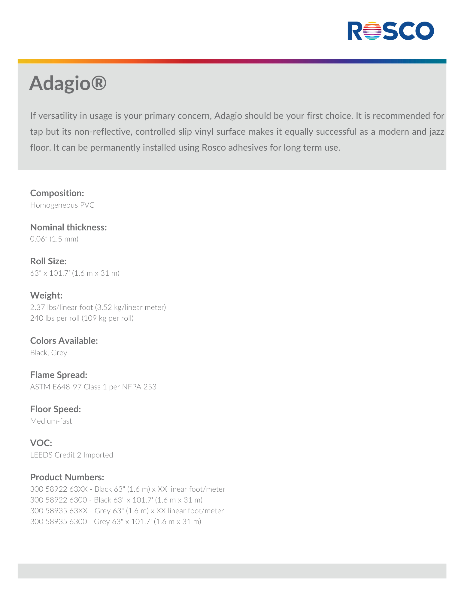 Rosco Adagio® Marley Dance Floor Rolls deliver unparalleled professional quality and versatility, ideal for all dance styles. With over a century of experience in entertainment and the arts, Rosco is an industry trusted source for premium dance flooring that delivers exceptional performance and longevity. Highly recommended for tap due to its enhanced sound quality, rugged construction, and optimal traction, Rosco Adagio® Rolls are designed to amplify percussive sounds ensuring every step is heard clearly. This premium quality marley dance floor offers the perfect amount of firmness for hard-sole shoes, while also providing the right grip characteristics that are required for softer shoes. All Rosco dance floors are engineered to provide a consistent, precise level of controlled slip without the need for rosin or other external materials.